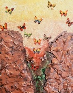 Schilderijen waarbij verschillende materialen zijn gebruikt, zoals gesso voor verdikking, jute, tekstlint, houten figuurtjes, eierdozen