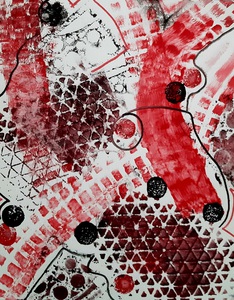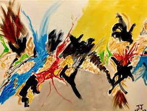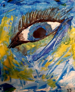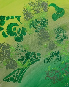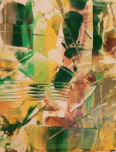 2024Tinten geel in verschillende nuances met vogel in het midden. Alles met palletmessen aangebracht